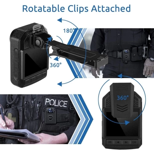 ·Lightweight & Compact & 360 Degree Rotation Clips Personal surveillance camera with Lightweight and compact is equipped with two stable 360 Degree rotation clips, fits to clip on shoulder straps of backpack or on polo shirt or on belt. In addition, portable security body cam can also be set to work as a dash camera for your vehicle.