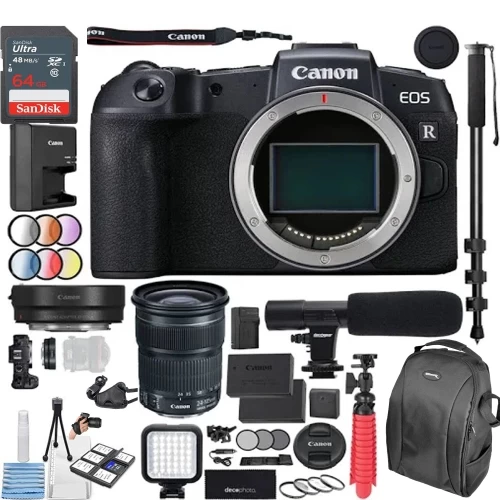 Impressively small despite having a large full-frame sensor, the Canon EOS RP offers flexible imaging capabilities along with a portable form factor. Featuring a high-resolution 26.2MP full-frame CMOS sensor along with a DIGIC 8 image processor, both stills and UHD 4K video can be recorded using a broad sensitivity range, from ISO 100-40000, to suit working in a variety of lighting conditions. Continuous shooting is also supported at up to 5 fps for photographing moving subjects. The sensor also facilitates an advanced Dual Pixel CMOS AF system, with 4779 selectable on-sensor phase-detection points for quickly and accurately acquiring focus during stills and video operation.Complementing the sensor and processor, the RP also sports a 2.36m-dot OLED electronic viewfinder along with a rear 3.0 1.04m-dot vari-angle touchscreen LCD monitor for easier viewing from high and low angles. Additionally, Wi-Fi and Bluetooth allow for wireless remote camera control along with direct image sharing to linked mobile devices. Canon RF Lens Mount