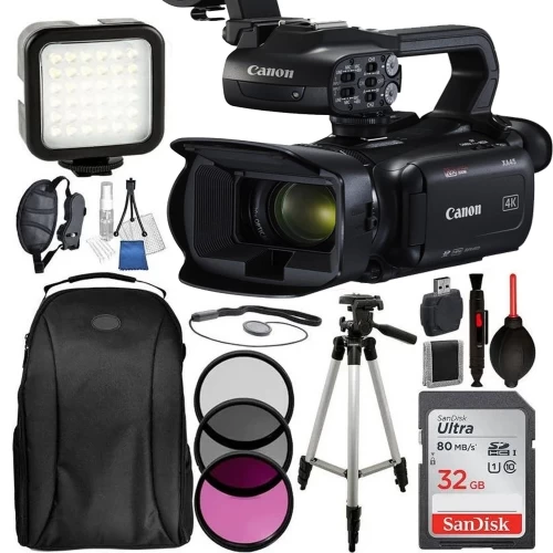 The Canon XA45 Professional UHD 4K Camcorder is a compact, lightweight camera featuring UHD 4K capture, a 1/2.3 CMOS sensor, two XLR audio inputs, and one mini-HDMI, and one BNC 3G-SDI output which fits right into the ENG category for documentary or journalism-style productions.The XA45s optics include an integrated 20x HD optical zoom and an eight-bladed circular iris for more natural highlights. The cameras pro-style features include Hybrid, Normal, Face Only, Manual Focus, Instant, and Canons Medium autofocus; fast- and slow-motion recording, full manual control, optical and electronic image stabilization, a 3 touchscreen LCD, user-assignable buttons, infrared mode, and a DIG!C DV 6 image processor with high sensitivity and low noise. The XA45 also has display monitoring features such as zebra, color bars, and test tone.The camera records UHD 4K30 and Full HD 1080p60 captured to dual SD card slots, and outputs to mini-HDMI and 3G-SDI ports. The dual SD card slots allow for automatic switching from one card to another, as well as simultaneous recording to both. The camera can output up to 1920 x 1080p 10-bit 4:2:2 video at 59.94 fps via its mini-HDMI and 3G-SDI outputs. On the audio side, the XA45 features up to four channels of LPCM audio with manual/automatic recording levels, two XLR inputs with phantom power, and a 3.5mm stereo mini input. It features a built-in stereo microphone as well as a headphone jack. Features