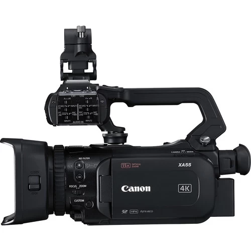The Canon XA55 Professional UHD 4K Camcorder is a compact, lightweight camera featuring UHD 4K capture, a 1 CMOS sensor, two XLR audio inputs, and one mini-HDMI, and one BNC 3G-SDI output which fits right into the ENG category for documentary or journalism-style productions.The XA55s optics include an integrated 15x HD optical zoom and a nine-bladed circular iris for more natural highlights, and wide DR gamma support for low-light recording. The cameras pro-style features include Dual Pixel and Contrast autofocus, fast- and slow-motion recording, full manual control, optical and electronic image stabilization, a 3 touchscreen LCD, user-assignable buttons, infrared mode, and a DIG!C DV 6 image processor with high sensitivity and low noise. The XA55 also has display monitoring features such as zebra, color bars, and test tone and a built-in neutral density filter mechanism offering ND4, ND16, and ND64 options.The camera records UHD 4K30 and Full HD 1080p60 captured to dual SD card slots, and outputs to mini-HDMI and 3G-SDI ports. The dual SD card slots allow for automatic switching from one card to another, as well as simultaneous recording to both. The camera can output up to 1920 x 1080p 10-bit 4:2:2 video at 59.94 fps via its mini-HDMI and 3G-SDI outputs. On the audio side, the XA55 features up to four channels of LPCM audio with manual/automatic recording levels, two XLR inputs with phantom power, and a 3.5mm stereo mini input. It features a built-in stereo microphone as well as a headphone jack. The cameras functions can also be controlled by the separately available RC-V100 remote control. Features