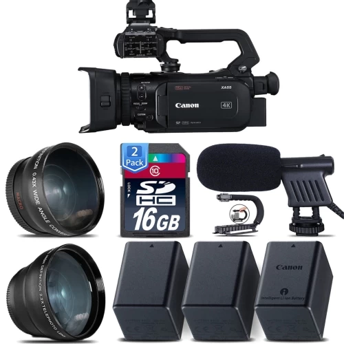 The Canon XA55 Professional UHD 4K Camcorder is a compact, lightweight camera featuring UHD 4K capture, a 1 CMOS sensor, two XLR audio inputs, and one mini-HDMI, and one BNC 3G-SDI output which fits right into the ENG category for documentary or journalism-style productions.The XA55s optics include an integrated 15x HD optical zoom and a nine-bladed circular iris for more natural highlights, and wide DR gamma support for low-light recording. The cameras pro-style features include Dual Pixel and Contrast autofocus, fast- and slow-motion recording, full manual control, optical and electronic image stabilization, a 3 touchscreen LCD, user-assignable buttons, infrared mode, and a DIG!C DV 6 image processor with high sensitivity and low noise. The XA55 also has display monitoring features such as zebra, color bars, and test tone and a built-in neutral density filter mechanism offering ND4, ND16, and ND64 options.The camera records UHD 4K30 and Full HD 1080p60 captured to dual SD card slots, and outputs to mini-HDMI and 3G-SDI ports. The dual SD card slots allow for automatic switching from one card to another, as well as simultaneous recording to both. The camera can output up to 1920 x 1080p 10-bit 4:2:2 video at 59.94 fps via its mini-HDMI and 3G-SDI outputs. On the audio side, the XA55 features up to four channels of LPCM audio with manual/automatic recording levels, two XLR inputs with phantom power, and a 3.5mm stereo mini input. It features a built-in stereo microphone as well as a headphone jack. The cameras functions can also be controlled by the separately available RC-V100 remote control. Features