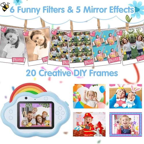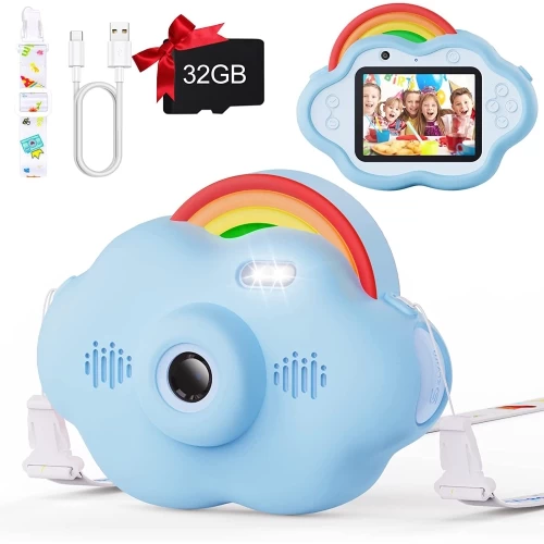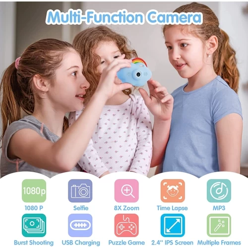 Digital Camera For Kids With Rainbow Design, 2.4-inch IPS Screen, Dual Camera, 8x Zoom, Mp3, Video Recording, And Built-in 1000mAh Battery. (Blue)