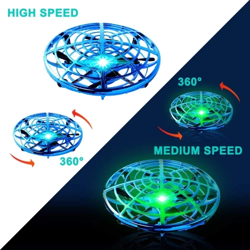 2 Flying Speed and 3 Lights You can turn on the drone and adjust the speed mode by clicking the button which is in the battery. Red & blue & green flashing alternately means preparing, green light means ready and medium speed, blue light means high speed, red light means out of battery and you need to charging now. Whats more, hand drone with shining light in the night sky is more colorful which is attracting sights as well as bring more joy.