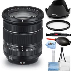 Well-suited for a wide variety of shooting situations, the FUJIFILM XF 16-80mm f/4 R OIS WR is a versatile 24-120mm-equivalent zoom, spanning wide-angle to medium-telephoto, and featuring a constant f/4 maximum aperture. Complementing this flexible design is an advanced optical layout, which includes a trio of aspherical elements and one ED aspherical element that help to minimize a variety of aberrations in order to produce high sharpness and clarity. A Super EBC coating also improves contrast and color neutrality by reducing flare and ghosting when working in strong lighting conditions. Also benefiting use in a variety of situations is a quick and quiet autofocus system along with a six stop-effective image stabilization system that minimizes the appearance of camera shake. Additionally, the lens is fully weather-sealed for working in inclement conditions.