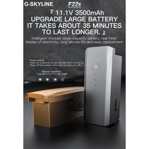 【Intelligent Lithium battery】 This drone comes with one rechargeable Lithium battery that is 11.1V 3500mAh Lithium Battery yields up to 35 mins flight time! Remote Control has a 3.7V 1500mAh Lithium Battery.
