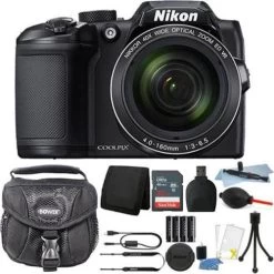 The black COOLPIX B500 Digital Camera from Nikon features a 16MP 1/2.3 BSI CMOS sensor for high-resolution imagery as well as Full HD 1080p video. This sensors construction utilizes a stacked backside-illuminated design to improve clarity and image quality when working in dimly-lit conditions. The 40x optical zoom lens provides a 35mm equivalent focal range of 22.5-900mm, covering wide-angle to telephoto perspectives to suit working in a wide variety of environments. Further subject magnification can be achieved using the 80x Dynamic Fine Zoom that effectively doubles the cameras reach. The lens also features Vibration Reduction to help reduce the appearance of camera shake when shooting at the longer zoom lengths or with longer shutter speeds. A 3 921k-dot tilting LCD screen allows image composition from unique angles, as well as image review and menu navigation.Built-in Bluetooth low energy (BLE), Wi-Fi, and NFC connectivity allow the B500 to pair with a compatible smart device using the Nikon SnapBridge app. Images can then be easily sent to the connected smartphone or tablet, and from there shared on favorite social media sites. Designed for simple, stress-free operation with point and shoot capability for both still imagery and video, convenience is maximized by selecting from among 18 scene modes or using the Easy Auto Mode, which automatically optimizes the cameras settings even while shooting under challenging lighting conditions.16MP Image Sensor