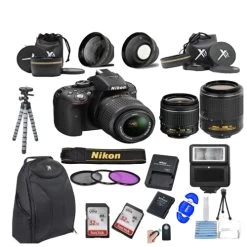 The black Nikon D5300 DSLR Camera features a DX-format 24.2 megapixel sensor and EXPEED 4 image processor to produce high-resolution still imagery and full HD video with notable low-light sensitivity to ISO 12800 and a fast continuous shooting rate of 5 fps. The sensor design omits the traditional optical low-pass filter in order to gain the utmost sharpness and resolution from both photos and videos. Complementing the imaging assets are both a versatile 39-point autofocus system, with nine cross-type sensors, and a 2,016-pixel RGB sensor for precise exposure metering in a wide variety of lighting conditions. Additionally, 1920 x 1080p movie recording is supported, in multiple frame rates up to 60 fps, with full-time continuous auto focusing capabilities.The compact, yet durably designed, camera body incorporates both an optical pentamirror optical viewfinder along with a large 3.2 1,037k-dot vari-angle LCD monitor, which features a 180° swivel design to better support working from high and low angles. Also integrated into the D5300 are both Wi-Fi and GPS modules, which enable advanced image sharing capabilities as well as location-based image tagging. When paired with an Android or iOS mobile device, remote viewing and control over the shutter release is possible from a distance and a vast network of pre-populated Points of Interest adds to the overall geotagging functionality.For creatively enhancing the look and feel of imagery in-camera, a wide range of Picture Control modes, Scene Modes, and Special Effects modes are available as well as a host of in-camera image editing capabilities for adjusting settings prior to sharing. Built-in HDR and Active D-Lighting modes can also be used to optimize exposure results by preserving highlight and shadow details for an extended range of apparent tones.Included with the D5300 camera body is the AF-S DX NIKKOR 18-55mm f/3.5-5.6G VR II lens; a standard zoom providing a 35mm-equivalent focal length range of 27-82.5mm. This lens incorporates a robust VR image stabilization system, which helps to minimize the appearance of camera shake by up to four shutter speed steps to benefit working in low-light conditions. A Super Integrated Coating reduces flare and ghosting to optimize image clarity, contrast, and color neutrality and a rounded seven-blade diaphragm works to create a pleasing out-of-focus quality in shallow depth of field images.24.2MP DX-Format Sensor and EXPEED 4 Processor