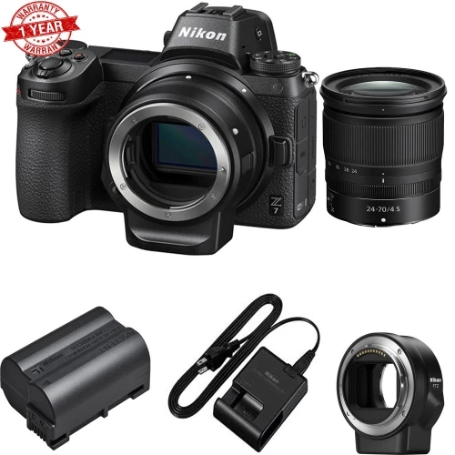 Mixing a new camera with the ability to use your legacy glass, the Nikon Z7 Mirrorless Digital Camera with FTZ Mount Adapter Kit. The FX-format mirrorless camera body with the FTZ Mount Adapter.Nikon Z7 Mirrorless Digital Camera (Body Only)Nikon has taken the next step in their imaging journey with the Z7 Mirrorless Camera, dubbed The Perfectionist, and the revolutionary Z System. This high-resolution FX-format camera introduces the Z Mount, a large diameter design with a short 16mm flange distance that allows Nikon to create compact, yet powerful cameras and develop more advanced optics. The Z7 is among the first in the series, and brings with it a 45.7MP BSI CMOS sensor and EXPEED 6 Image Processing Engine, delivering outstanding image quality and speed with a native sensitivity range of ISO 64-25600.On the sensor you will find an advanced phase-detect autofocus system using 493 points covering 90% of the image area and the sensor features 5-axis Vibration Reduction technology for stabilized photos and video regardless of the lens used. This advanced hybrid AF system will also benefit video. The Z7 features UHD 4K recording at up to 30p and can use the N-Log gamma profile along with the cameras 10-bit HDMI output to create cinema-quality video. The cameras high-resolution sensor also permits the use of an 8K Time-Lapse mode.As with many mirrorless systems, the Z Series boasts a much more compact form factor than its DSLR counterparts. The Z7 is no exception with its slimmed down design and lighter build, though it maintains the weather sealing and ergonomics for which Nikon is known. The camera features multiple displays and screens for ease of use, including a 0.80x 3.6m-dot EVF with NIKKOR optics and a Fluorine coating, ensuring clear viewing. The rear of the camera is equipped with a 3.2 2.1m-dot tilting touchscreen LCD while the top offers a dot-matrix OLED for quickly checking settings. For storage, the Z7 has a single XQD card slot that is compatible with CFexpress for faster speeds in the future. Additionally, the body is equipped with both Wi-Fi and Bluetooth.Nikon Z System