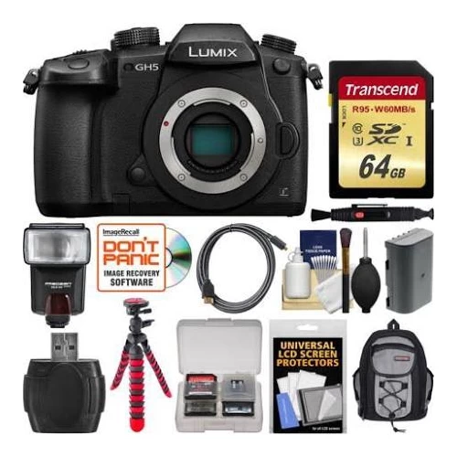 Get the ball rolling with an advanced and powerful video setup by investing in the Panasonic Lumix DC-GH5 Mirrorless Micro Four Thirds Digital Camera with 12-35mm Lens and Pro HDR Kit. This package squeezes in the 4K-shooting GH5 with a versatile 12-35mm f/2.8 lens, which is equivalent to 24-70mm, and a V-Log L function activation code for maximum dynamic range. Taking it to the next level is the inclusion of the Atomos Ninja Inferno 7 recorder/monitor, Atomos Power Kit, and a coiled HDMI cable that will let you capture the 4K footage at up to 60 fps with real-time HDR monitoring.Panasonic Lumix DC-GH5 Mirrorless Micro Four Thirds Digital Camera (Body Only)Upgraded, redesigned, and filled with features, the Lumix DC-GH5 Mirrorless Micro Four Thirds Digital Camera from Panasonic provides an outstanding imaging platform for shooters who demand some of the best video and still photography quality they can get in a single compact camera. At the heart of the camera is a 20.3MP Digital Live MOS sensor and a newly developed Venus Engine processor, which both offer dramatically improved processing times over its predecessor. This enables the ability to record 4K video at up to 60 fps, 10-bit 4:2:2 internal recording with select settings, Full HD video at up to 180 fps, 12 fps continuous shooting, and sensitivities up to ISO 25600. Also, the camera features built-in 5-axis sensor stabilization, which can work with certain lenses to activate Dual I.S. 2 for highly effective shake correction that can compensate for up to 5 stops of shutter speed. Other improvements include a speedier and more accurate Advanced DFD autofocus system that can lock on in just 0.05 seconds, as well as 6K PHOTO at 30 fps and 4K PHOTO at up to 60 fps.Along with all these internal improvements, the body received some significant upgrades as well. For viewing and composing images both the 0.76x OLED viewfinder and 3.2 free-angle touchscreen received resolution bumps to 3.68m dots and 1.62 m dots, respectively. This will make shooting more comfortable and more accurate. The magnesium alloy body is now freezeproof to 14°F in addition to splash and dustproof. For fast image transfer and saving, there are now two UHS-II SD card slots. Additionally, for a completely wireless setup it offers both Wi-Fi and Bluetooth for advanced functionality when paired with a mobile app.20.3MP Digital Live MOS Sensor and Venus Engine
