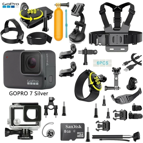 ·May be eligible for return. See the Return Policy tab for details.GoPro HERO7 Silver refurbishedMeet HERO7 Silver, the perfect camera for adventures big and small. It’s built tough and totally waterproof—just grab it and go for it. Smooth 4K video and vibrant WDR photos make every moment look amazing. GPS lets you track how fast, high and far you went. With an intuitive touch screen, it’s simple to jump right in and get great shots. Plus, your photos and videos move right to the GoPro app for easy sharing. From beach days to vacays to good times with the family—capture your life in a fresh new way with HERO7 Silver.4K30 VideoGet stunning 4K video that’s as amazing as the moment itself. You can also shoot time lapse videos to turn longer events into short, shareable moments.Rugged Plus WaterproofShare experiences you can’t capture with your phone. HERO7 Silver is tough, tiny, totally waterproof—and up for any adventure.Intuitive Touch ScreenWith a touch screen and simple, streamlined capture modes, it’s easy to jump right in and get great shots. Just swipe and tap.Voice ControlStay in the moment. Control your HERO7 Silver hands-free with voice commands like ‘GoPro, take a photo’ and ‘GoPro, start recording.’10MP Photos With WDRHERO7 Silver takes beautiful, vibrant 10MP photos—even in challenging shots that mix bright light and shadows. And with Burst mode, you can get 15 photos in one second.Video StabilizationAdios shaky footage. HERO7 Silver records smooth, steady video whether you’re skiing, snorkeling or chasing your dog around the yard.Shoot VerticallyCapture photos and videos in portrait orientation—perfect for your Snapchat and Instagram Stories.Photo TimerJump in there. A photo timer makes it easy to grab a GoPro selfie or group shot with your whole crew in the frame.Adapter The Kit Including:1 x Chest Strap, 1 x Head Belt Mount, 1 x Helmet Strap Mount, 1 x Car Suction Cup Mount (7cm Diameter), 1 x Tripod Adapter, 1 x Floating Handle Grip, 1 x Extendable Handle Monopod, 1 x 6Pcs Anti-fog Inserts, 2 x Sports camera long connection chain accessory, 2 x Sports camera short connection chain accessory, 1 x Handlebar Seat post Mount, 1 x Insurance Tether Strap Plus Adhesive, 4 x Long Screw, 1 x 360 Degree Rotating Clip Mount, 1 x 360 Degree Rotating Wrist Strap, 1 x Wifi Remote Control Wrist Strap, 1 x 3-Way Adjustable Pivot Arm, 1 x 2Pcs J-hook Mounts, 2 x Short Screw, 2 x Release Buckle, 2 x Flat Surface Mount