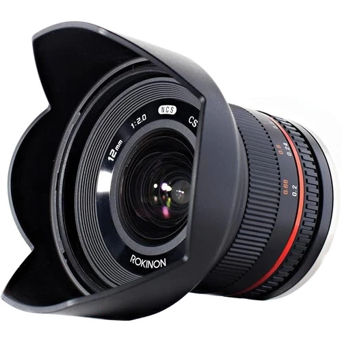 The black, Canon EF-M mount Rokinon 12mm f/2.0 NCS CS Lens is a prime wide-angle lens designed specifically for use with APS-C sized image sensors. Providing a 35mm-equivalent focal length of 19.2mm and a broad 98.9° angle of view, this lens is well-suited for architectural, interior, and landscape images. Its fast f/2.0 maximum aperture is further beneficial to working in low-light conditions.